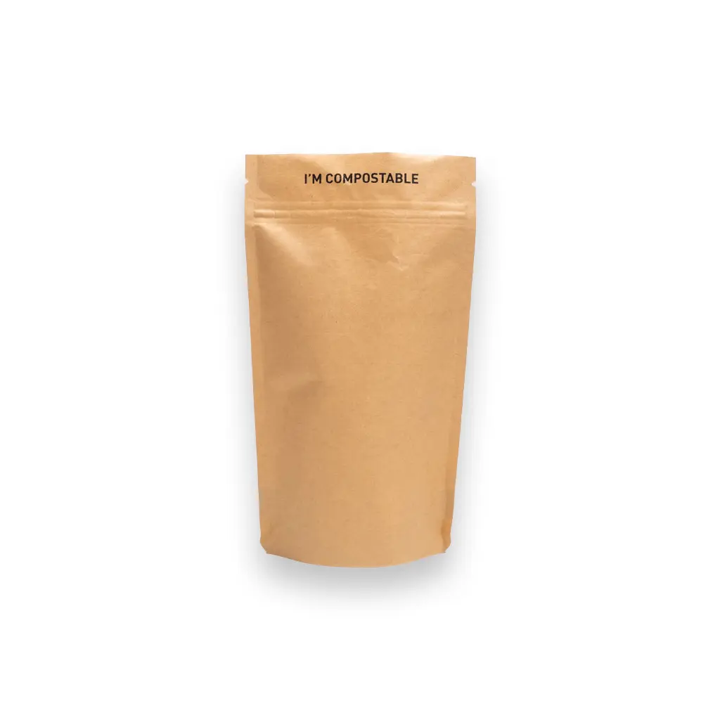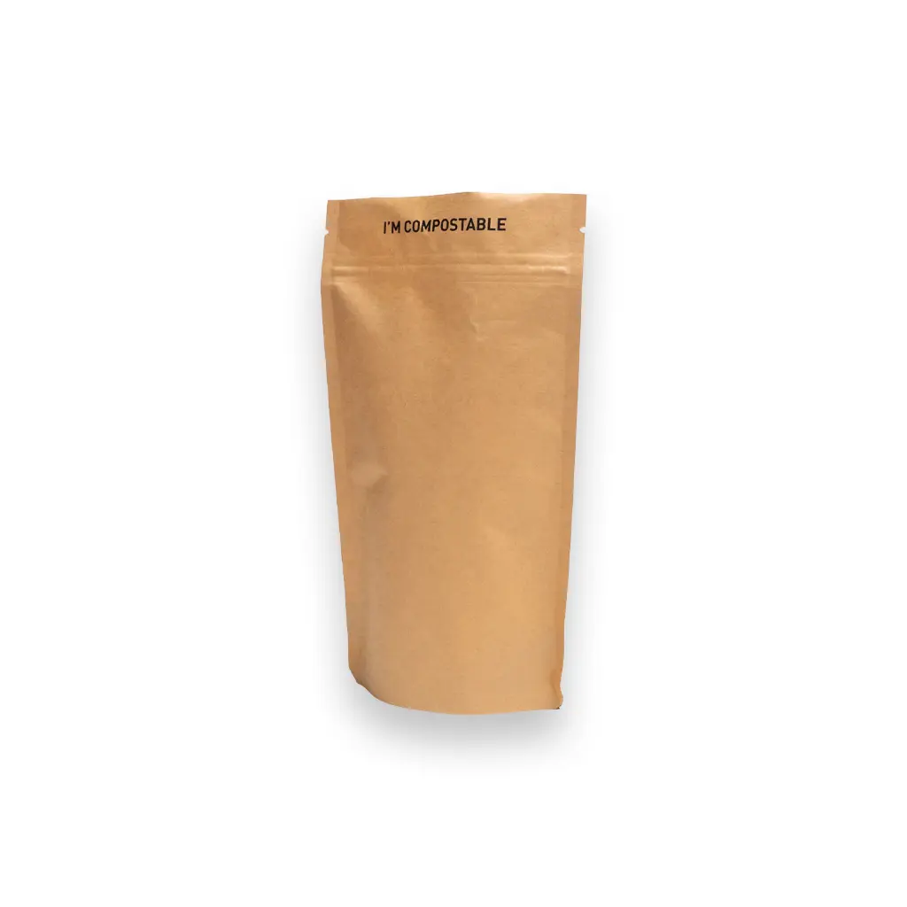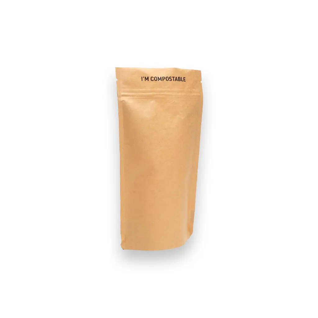 Dit is onze eerste volledig composteerbare stazak die is gemaakt van een combinatie van kraft papier en pla. PLA is een 100% bio based plastic gemaakt uit mais en suikerriet. Deze stazak kan ingezameld worden bij het GFT afval en zal in industriële composteerinstallatie composteren. Ook de lijm en de inkt die gebruikt zijn voor deze verpakking zijn gecertificeerd composteerbaar. De verpakking is hersluitbaar middels een gripsluiting, ook deze gripsluiting is gemaakt uit PLA. Tijdens de productie van PLA zien we een reductie van 60% CO2 uitstoot en een reductie van 50% niet hernieuwbare grondstoffen wanneer we dit vergelijken met de conventionele plastics als bijvoorbeeld PET (NatureWorks LCA,2014). U kunt de stazak na het afvullen ook definitief sluiten door deze aan de bovenzijde te sealen. Dit kunt u bijvoorbeeld doen met onze DaklaSealer. De stazak is geschikt voor het verpakken van food en non food producten. We adviseren om geen vloeistoffen te verpakken in deze verpakking.
