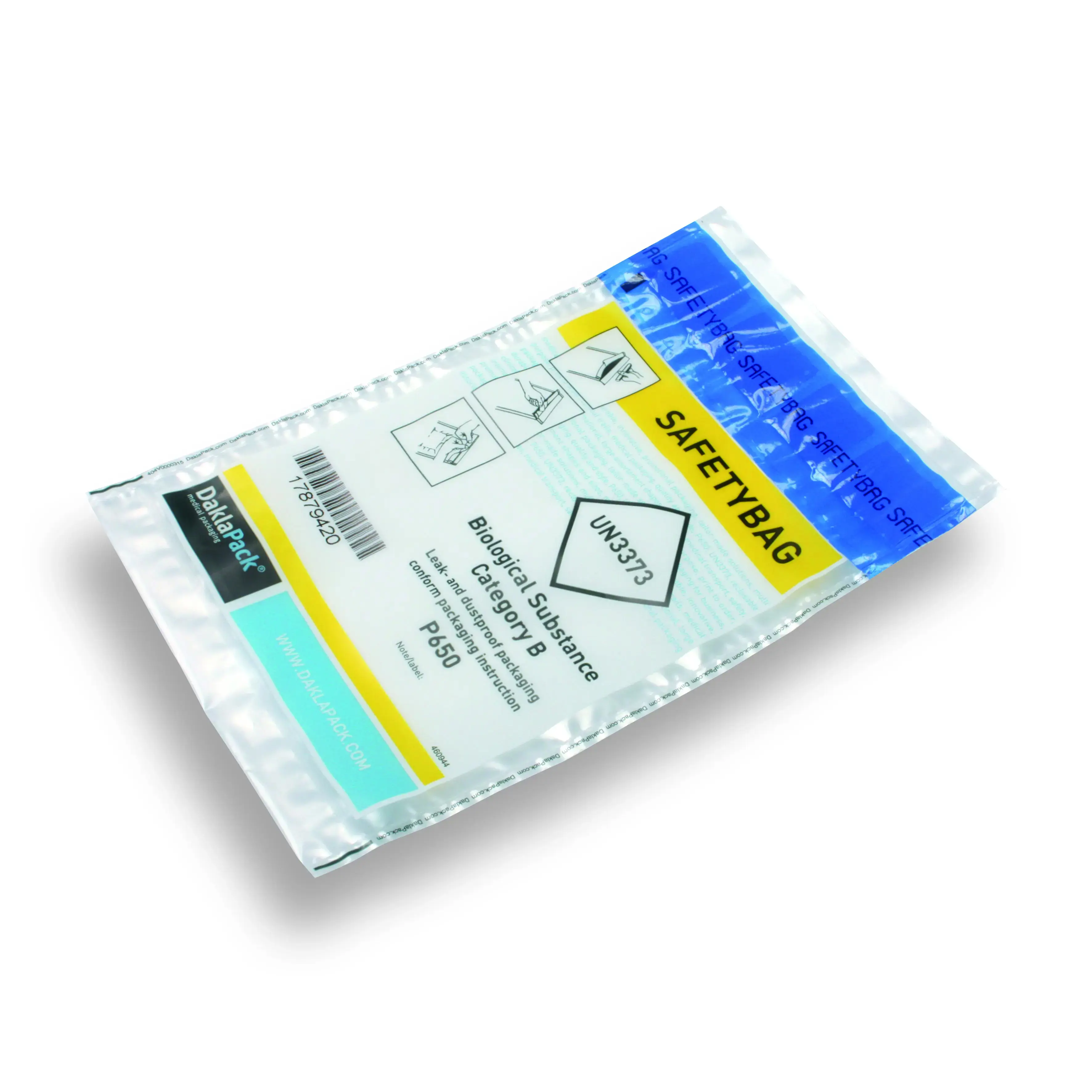 De Safetybag is voorzien van een absoluut vloeistofdichte zekerheidssluiting. De verpakking is gemaakt van sterk transparant polyethyleen en houdt gegarandeerd vloeistof binnen en buiten. Door de eenvoudig te verwijderen afdekstrip, wordt de zak hermetisch afgesloten. Openen is vereenvoudigd door de EasyOpen inkepingen. Deze Safetybag heeft aan de achterzijde een documentenvak. De Safetybag is zeer geschikt als secundaire, vloeistofdichte verpakking van bijvoorbeeld biologische stoffen uit categorie B. In combinatie met de Transportblister, de PolyMed verzendenvelop en voldoende absorberend materiaal, voldoet deze samenstelling aan de verpakkingsvoorschriften P650, P904 en PI959. Afwijkende formaten en bedrukkingen offreren wij u graag op aanvraag.